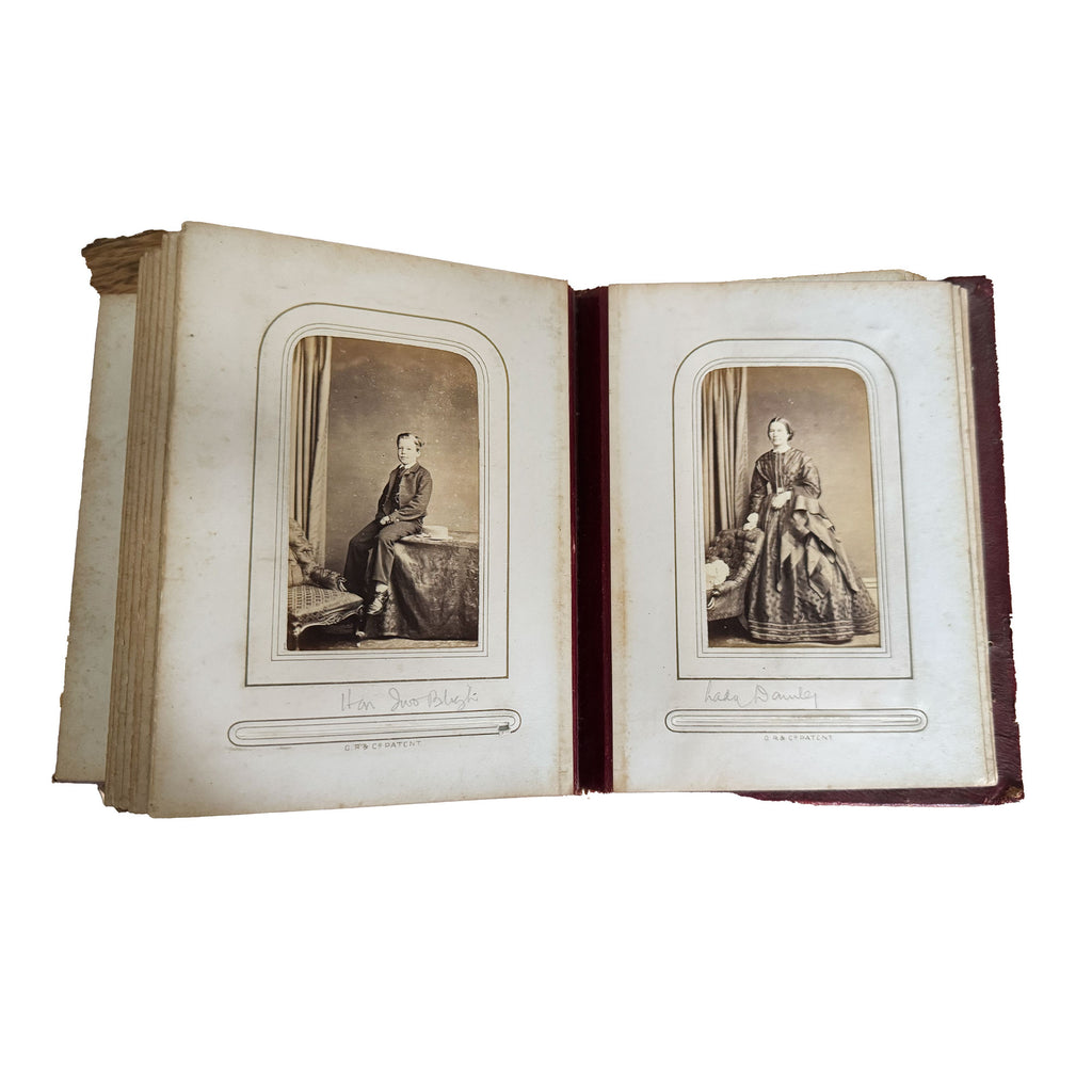 Antique Red Family Photo Album with 45 Sepia Portraits, Inscribed 1851