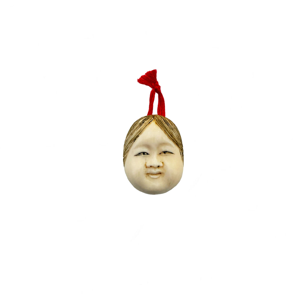 A beautiful piece of Japanese social history, this miniature "Okame" mask is a traditional bringer of happiness and good fortune. In Japanese folklore, Okame is portrayed with the cheerful, rounded features seen here. This netsuke was once a functional part of a gentleman’s attire, acting as a decorative toggle to secure items to a kimono sash.