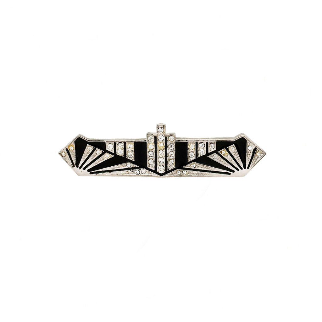 A stunning Art Deco style bar brooch featuring a striking geometric design. This piece is crafted with silver plated metal and is accented with white round faceted crystal stones and black enamel inlay.